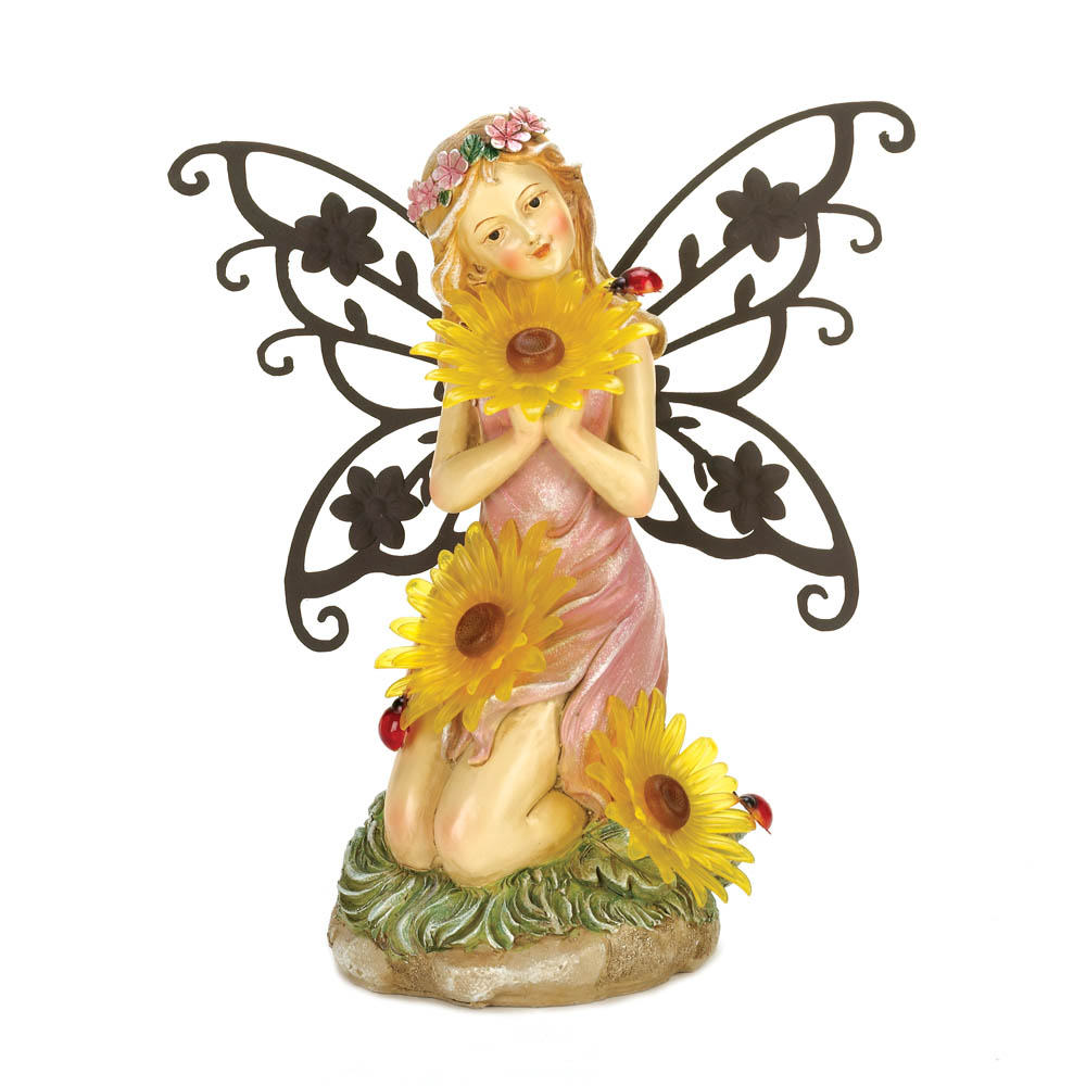 • This pretty fairy statue will make your garden or yard more beautiful, day and night.  When the sun's out, you'll enjoy her intricate detailing and iron wings. By night, the three yellow daisy blooms she holds will light up, powered by the built-in solar panel.