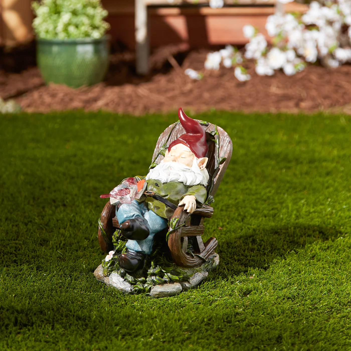 • This adorable outdoor statue features a sleepy gnome with his favorite book, taking a quick nap in his favorite rocking chair. The red bird on his knee lights up at night after soaking up the sun's rays all day.