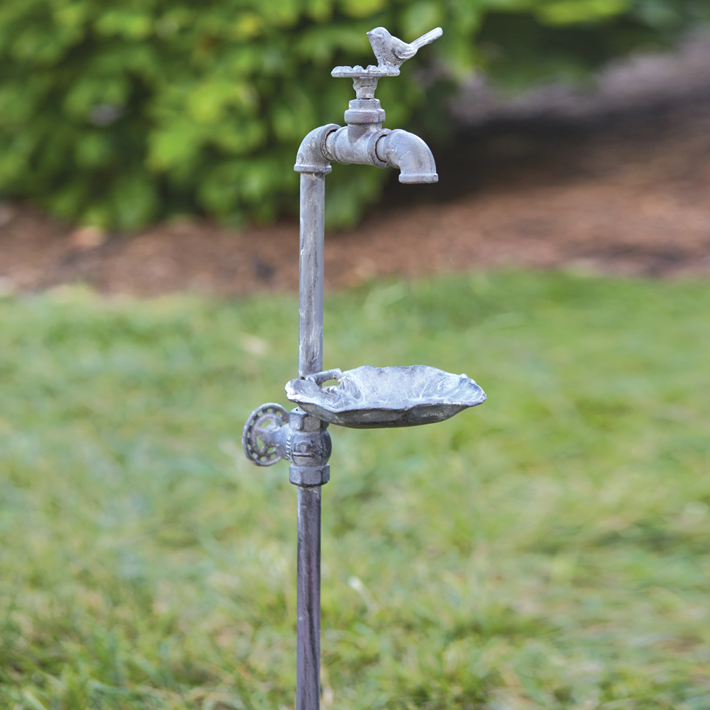 Our Spigot Garden Stake features a birdseed dish that is shaped as a lily pad with a frog. Lilly pad folds for easy storage. Feature in your garden or a potted plant.